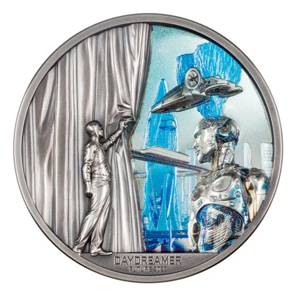 Thanks to the enhanced smartminting® technology this coin pictures this story on a stunning 2 oz silver coin. Discover the impressive contrast of antique finish in front of the curtain and a sophisticated colored proof area behind it showing futuristic vehicles, buildings and robots, all in ultra-high relief. This eye catching coin makes you feel like you are sitting in a theater and everybody is looking forward to what is behind the curtain.