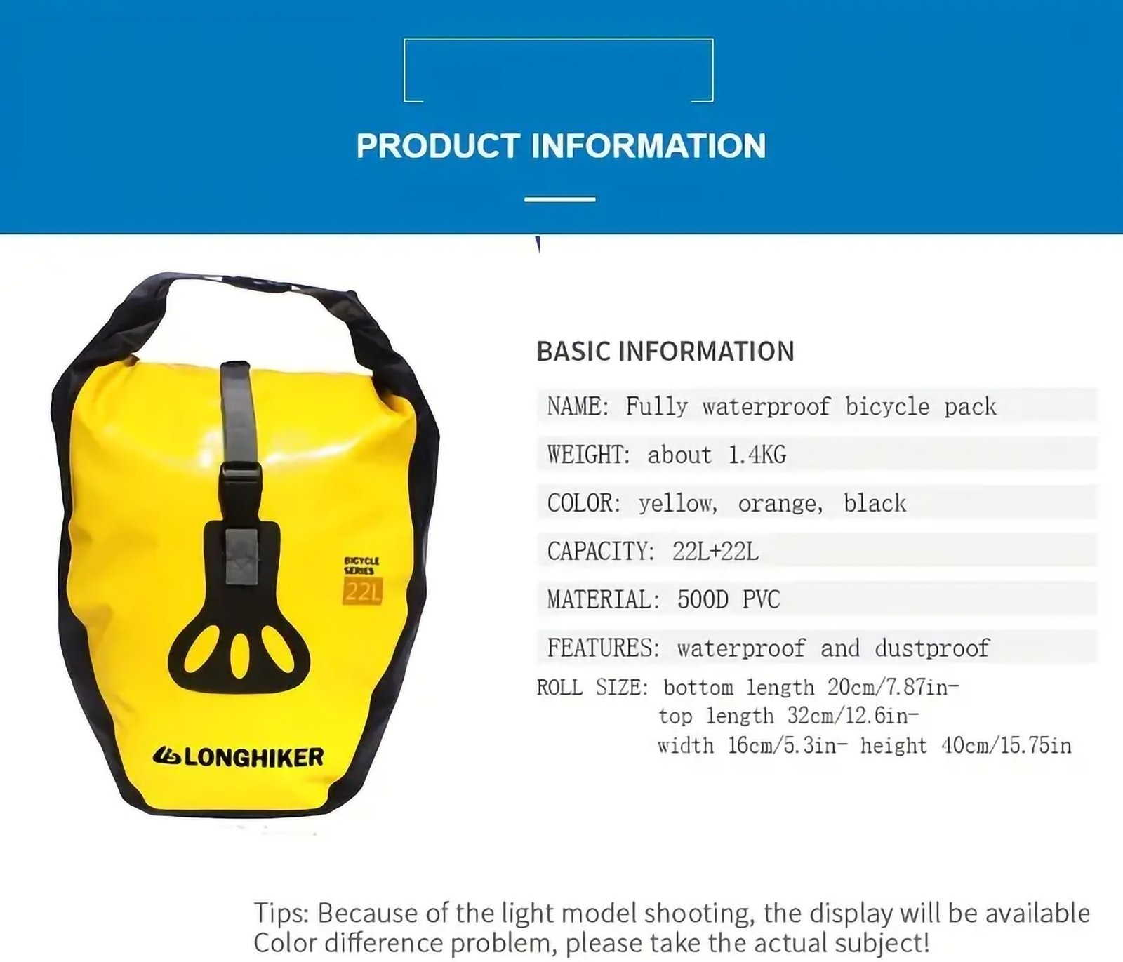 Upgrade your cycling adventures with the Waterproof Bike Pannier Bag, in bold Yellow and Orange. Whether youβre a casual cyclist or a dedicated rider, this versatile pannier bag offers ample storage, durability, and reliable protection from the elementsβmaking it a must-have for any biking journey.