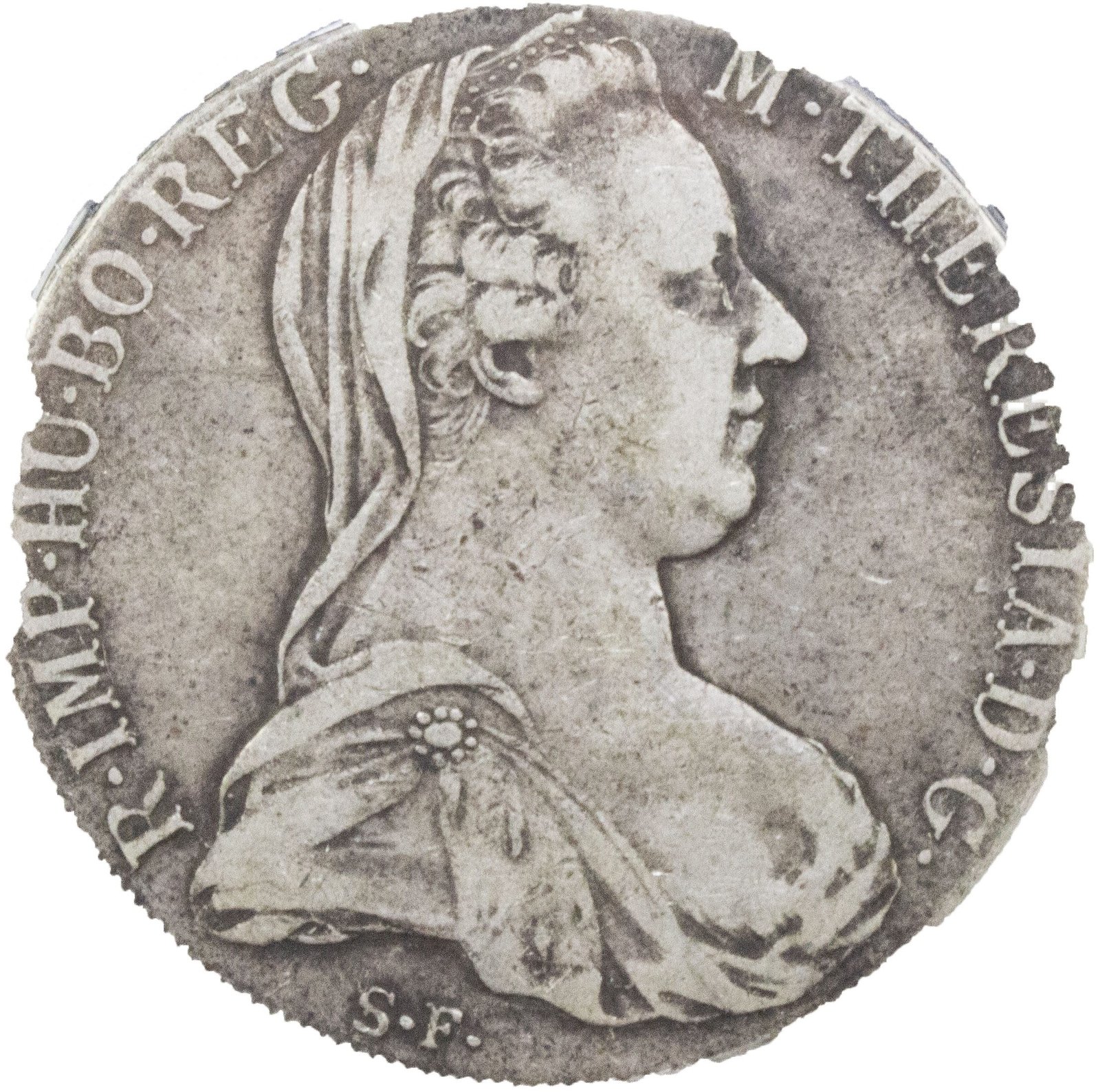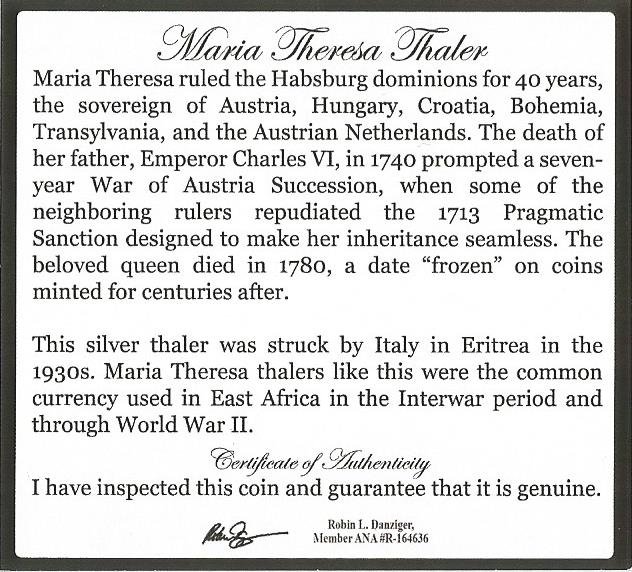 Maria Theresa ruled the Habsburg dominions for 40 years, the sovereign of Austria, Hungary, Croatia, Bohemia, Transylvania, and the Austrian Netherlands. The death of her father, Emperor Charles VI, in 1740 prompted a seven-year War of Austria Succession, when some of the neighboring rulers repudiated the 1713 Pragmatic Sanction designed to make her inheritance seamless. The beloved queen died in 1780, a date ”frozen“ on coins minted for centuries after.–This silver thaler was struck by Italy in Eritrea in the 1930s. Maria Theresa thalers like this were the common currency used in East Africa in the Interwar period and through World War II.